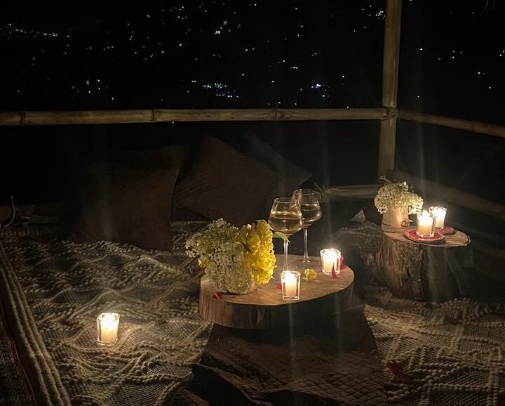 A romantic, private dining setup for two, surrounded by serene mountain views